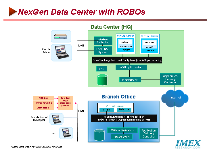 While a single application or appliance may not need enough bandwidth to justify a switch slot, multiple applications or virtual appliances aggregated together are another matter. While a traditional architecture might use a 16-port Gigabit Ethernet module to connect one switch to 16 servers, the virtual data center would put 16 virtual machines right on the module. These VMs will have little relation to what we now think of as servers. For maximum flexibility, workloads must be able to move among servers--or switches--without necessarily dragging data with them, so they won't contain hard disks, relying instead on storage area networks. Cisco thinks the same will happen to memory: It will migrate outside the server or VM, requiring a new type of network to link memory and CPU Next-Gen Data Centers Generally speaking, application-aware storage is a policy manager implemented as a software layer installed on top of storage, and on top of storage management utilities. The policy manager extracts the established technical rules and business policies necessary to make rudimentary decisions. "A policy manager is no good unless it's got good, viable rules and information to act upon those rules," Schulz says. "This allows the policy manager [application-aware storage software] to act upon those rules." This report is simply a must have for those wishing to reduce the overall costs of their Data Center.